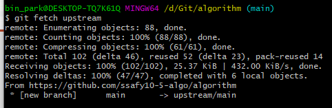upstream의 최신 상태를 받아와줍니다. 이 때, 브랜치는 최상위 브랜치여야합니다.