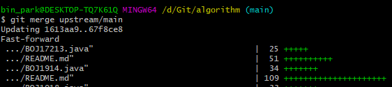 마지막으로 잘 머지된 내용을 원격 저장소에 push 해줍니다. 여기는 upstream이 아니라 내가 fork 해 온 레포지토리 원격 저장소에 올려줘야하니 리모트 저장소 이름에 origin을 해줍니다. 기본적으로 origin이지만 다르게 설정한 경우 그 리모트명을 사용해줍니다!