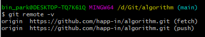아래 명령어를 통해 현재 프로젝트에 등록된 리모트 저장소를 확인해주니다.