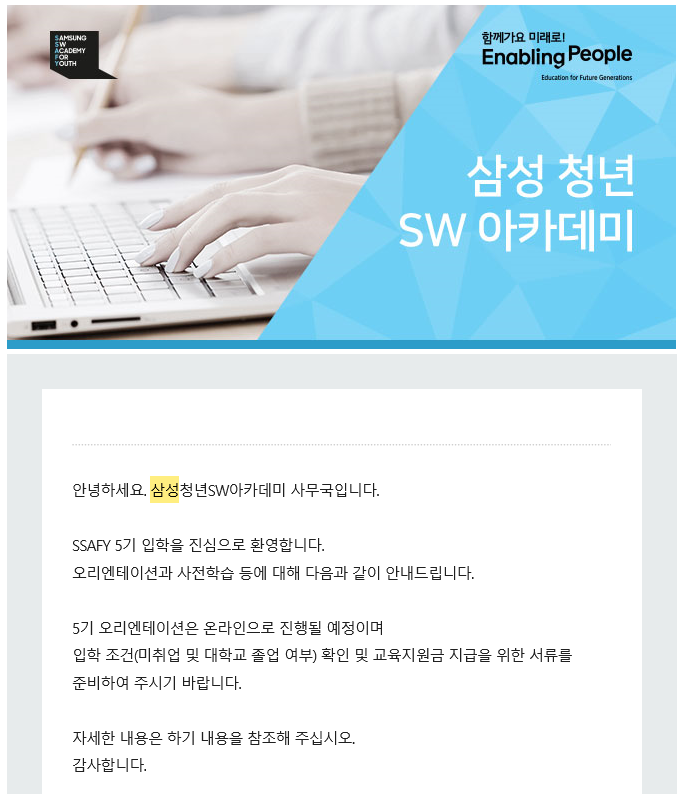 반포기상태로 우울한 며칠을 보내던 중 SSAFY 5기 입학을 환영한다는 메일을 받고 굉장히 기쁘고 설레했었다...! 진짜 취업된 것과 같이 와 ㅠㅠㅠㅠㅠ됐다 됐어! 우와! 하면서 정말 신났었다.