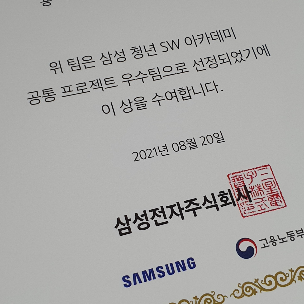 1학기가 끝나고 2학기 시작! 팀도 각자 짜야하고 새로운 분들과 하고 싶어서 나에게 연락준 분에게 헉 저야 감사하죠 하면서 숄랑숄랑 들어간 팀! 진짜 날 뽑아줬던 우리 팀장님 너무 고맙다. 싸피하면서 팀원 운이 없는 사람도 있는데 나는 굉장히 팀원 운이 좋았다. 팀원 분들 성격도 다 좋고 다들 열심히 해서 우리가 기획한 것을 완성할 수 있었다. 그 과정은 엄청 험난하긴 했지만... 어쨋든 반 우승! 삼성전자에서 상 받고 히죽...( ͡° ͜ʖ ͡°)