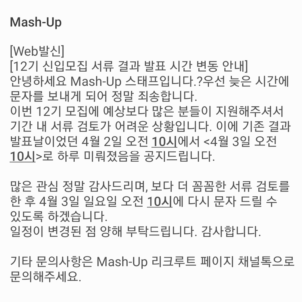 지원자가 많아서 발표가 하루 늦어진다는 문자였는데 이 문자가 내 심장을 더 쿵덕쿵덕하게 만들었다.