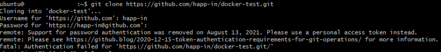 AWS에서 git clone을 하다가 다음과 같은 에러를 만났다. 2021년 8월 13일부터 비밀번호로는 보안문제로 로그인이 안된다고 한다. 해결법을 찾아보니 비밀번호 대신 Personal Access Tokens를 만들어서 넣으면 된다고 한다! Github Personal Access Tokens 1. 아래와 같이 Settings>Developer settings>Personal access token에 들어가서 우측 상단에 Generate new token을 눌러준다. 2. 이름과 Token의 기간을 설정해준다. 3. 아래와 같이 필요한 것을 다 선택해준다. 4. Generate token을 눌러서 생성하면 끝! 생성하기를 누른 뒤에 Token이 생성되어 있는 것을 볼 수 있다. 이 페이지에서 나가면..